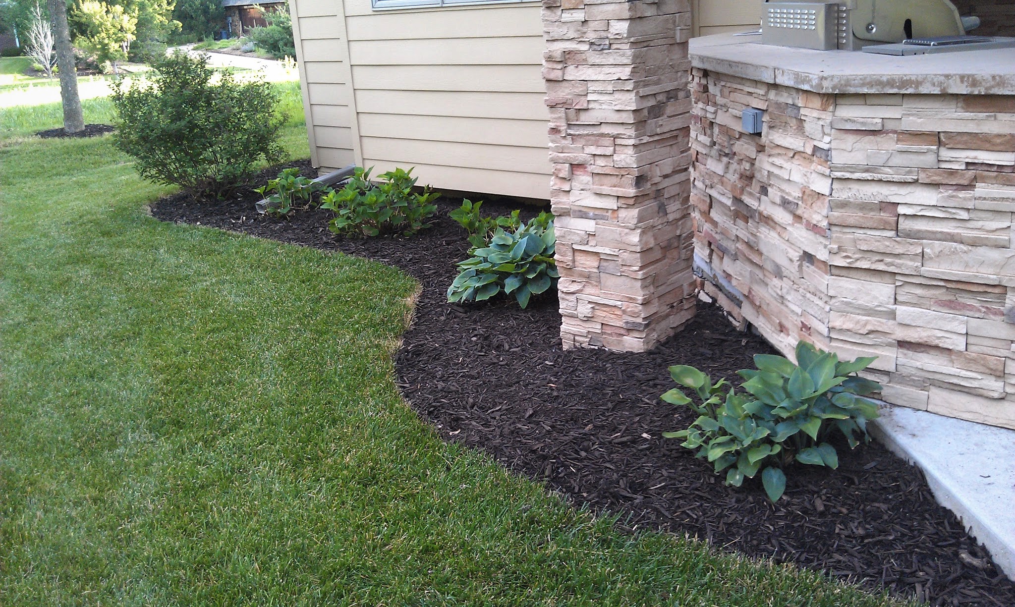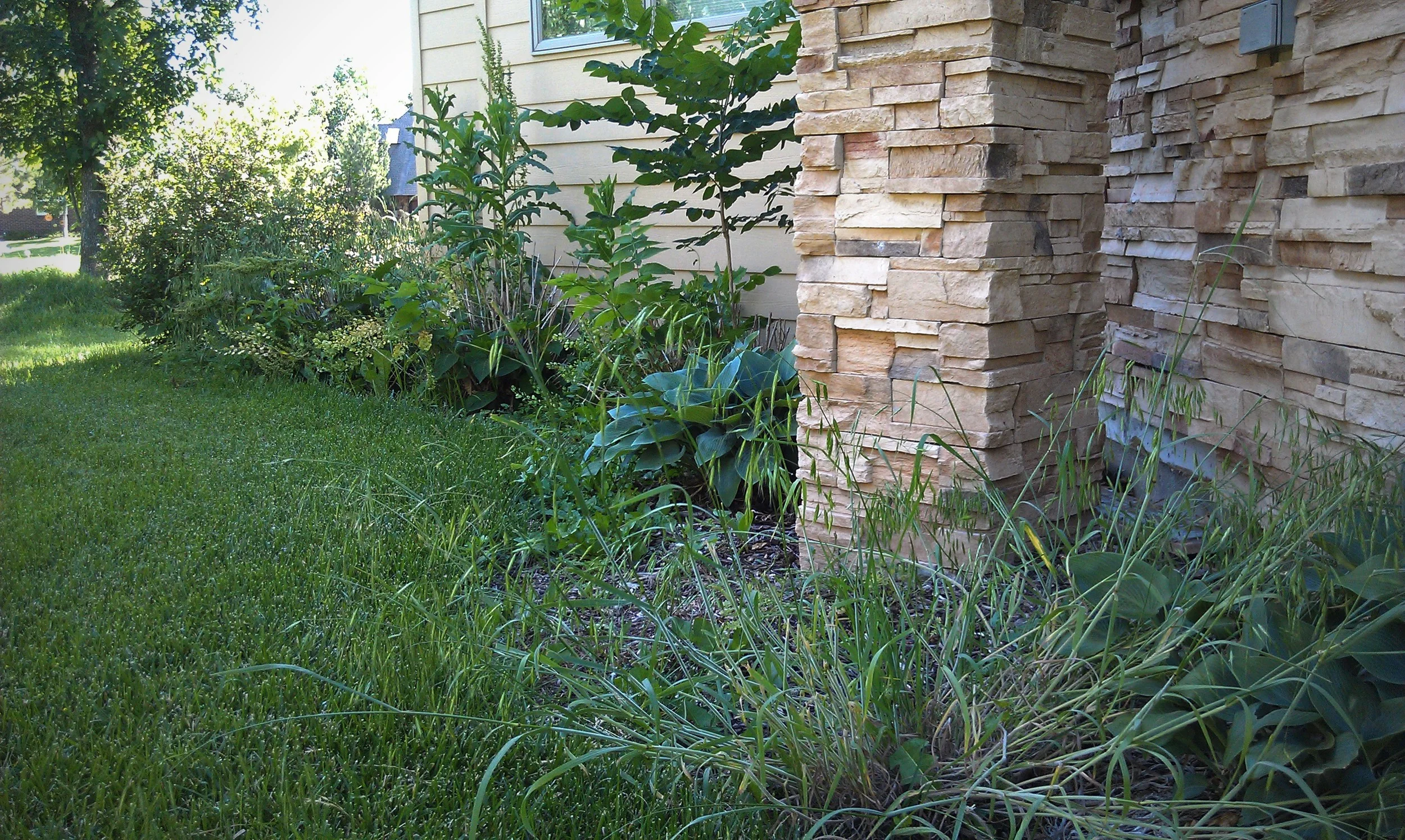 A little careful work uncovered some hostas, hydrangeas, and dwarf lilac. Scheduled attention from this point on will lead to healthier plants and reduced area for weeds to grow.