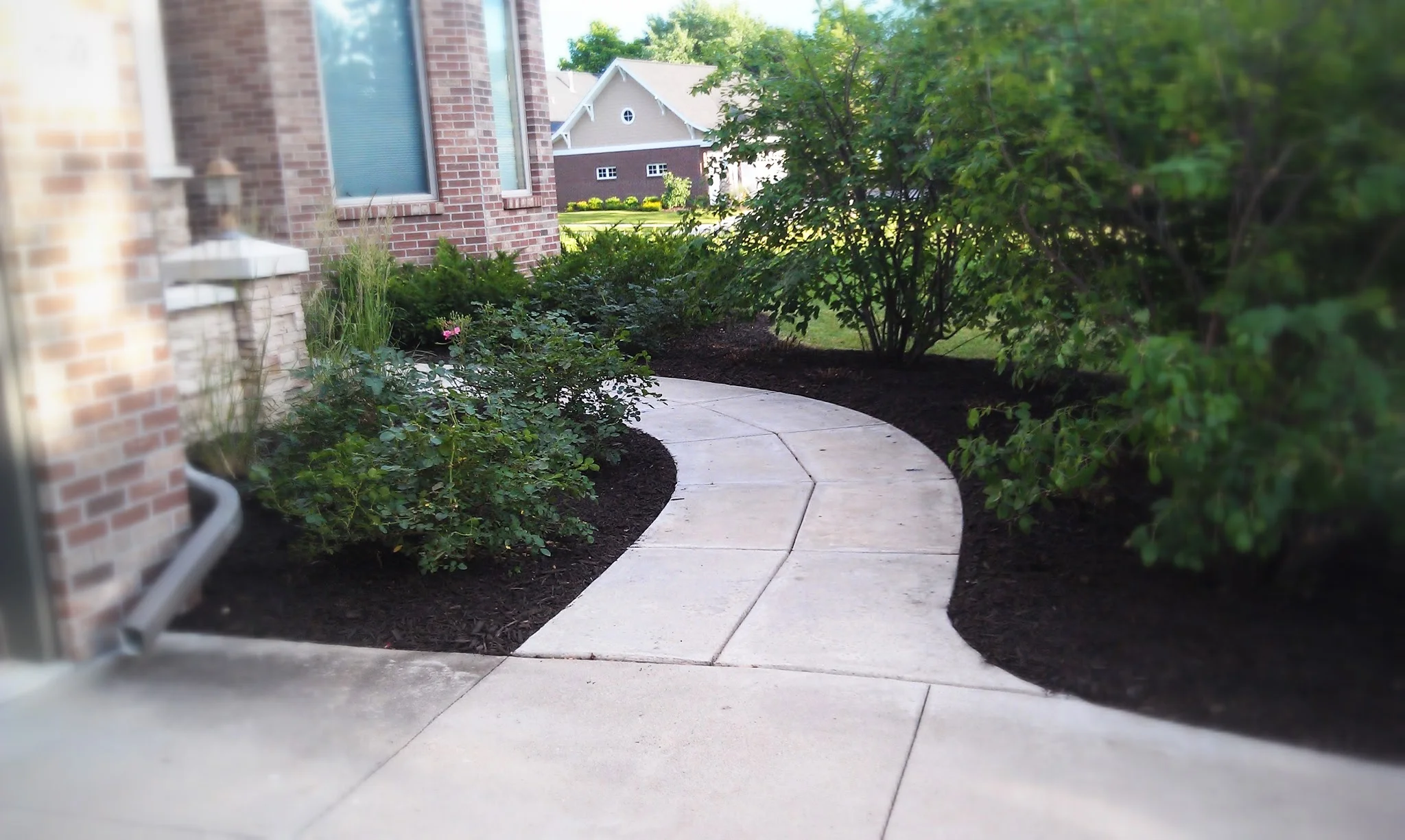 Careful pruning and a fresh application of mulch make an immediate impact on this front entrance. (The roses will be blooming again soon.)